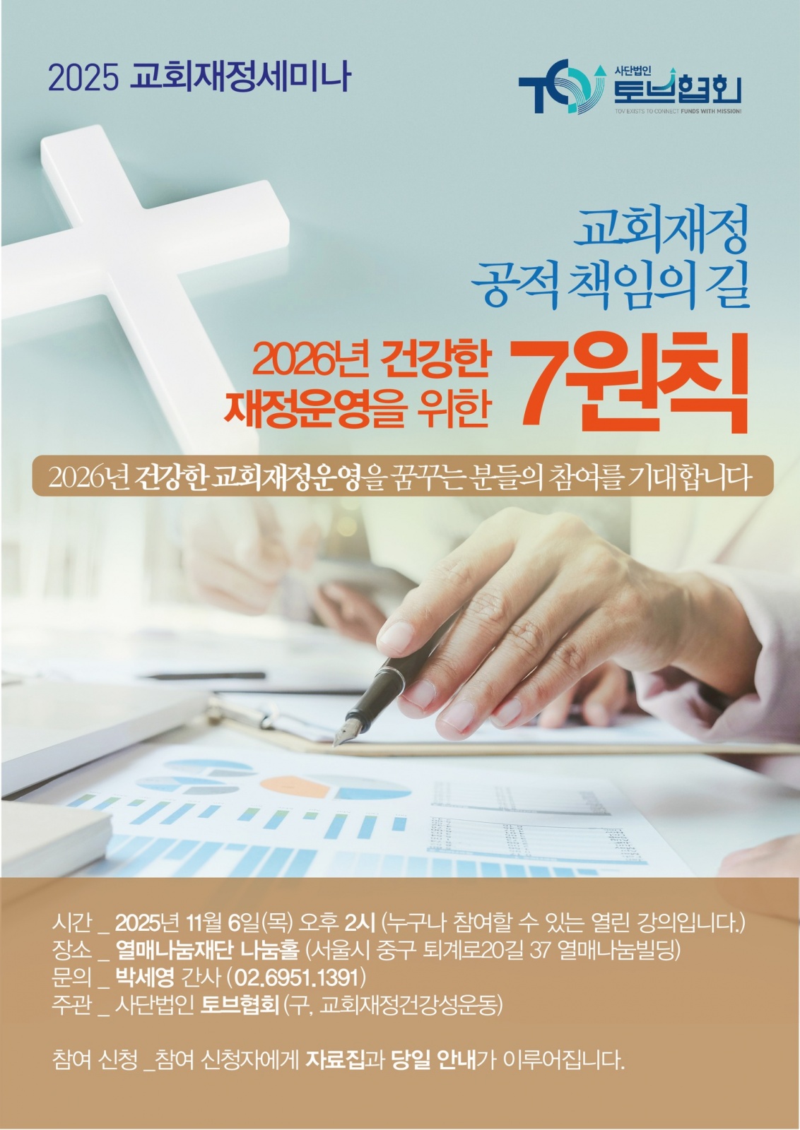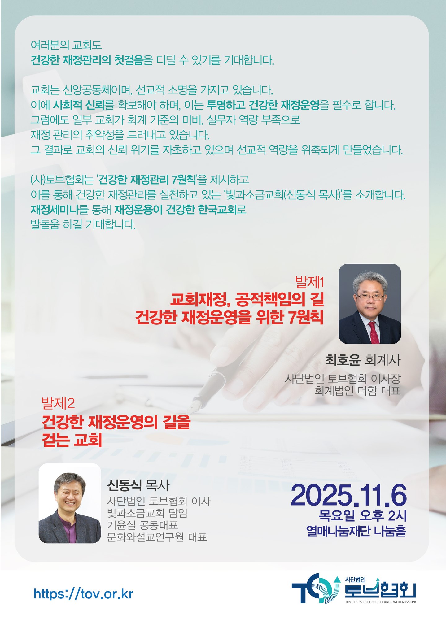 교회는 신앙공동체이며, 선교적 소명을 가지고 있습니다. 이에 사회적 신뢰를 확보해야 하며, 이는 투명하고 건강한 재정 운영을 필수로 합니다. 그럼에도 일부 교회가 회계 기준의 미비, 실무자 역량 부족으로 재정 관리의 취약성을 드러내고 있습니다. 그 결과고 교회의 신뢰 위기를 자초하고 있으며, 선교적 역량을 위축되게 했습니다. 이에 (사)토브협회는 ‘건강한 재정 관리 7원칙’을 확산하고, 재정 운영의 전문성을 강화하기 위해 교회재정 실무자를 대상으로 한 세미나를 기획하였습니다. 2026년 교회 재정 운영을 고민하는 분들의 많은 참여를 기대합니다.