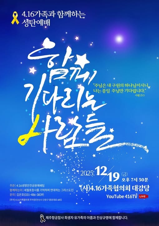 2025년 4.16가족과 함께하는 성탄예배가 12월 19일(금) 저녁 7시 30분에 4.16가족협의회 대강당에서 있습니다. 이번 성탄예배는 12.29 무안공항 제주항공 여객기참사 유가족과 함께합니다.