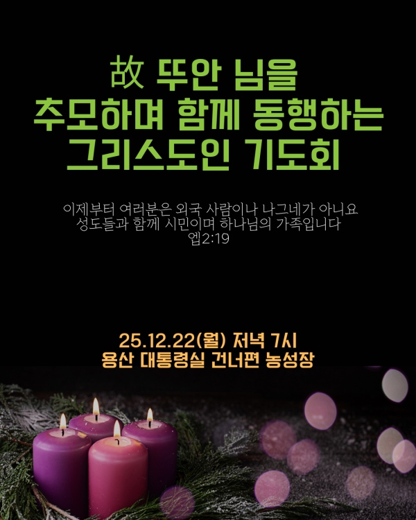 이에 故 뚜안 님을 추모하고 유족들을 위로하는 마음으로 그리스도인 기도회를 준비했습니다. 법무부의 무리한 미등록 이주노동자 강제단속을 규탄하며, 정부에 이에 대한 진상 규명과 책임자 처벌을 요구합니다. 다시는 이주노동자들의 헛된 죽음이 없기를 기도하며, 이 땅의 모든 이주민들이 평등하고 안전하게 살아가는 세상이 오기를 기다립니다.