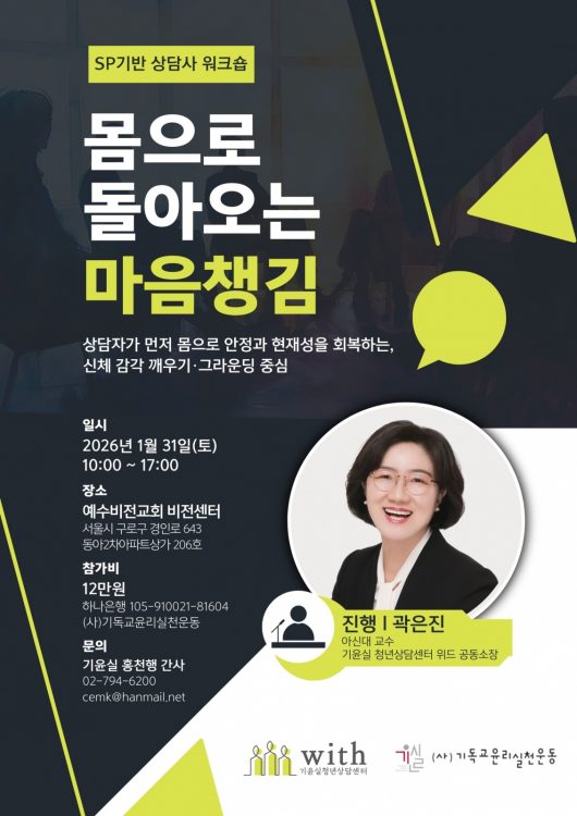 상담 현장에서 언어의 한계를 느끼며 내담자의 아픔을 함께 짊어지고 계신 동료 상담사 여러분을 초대합니다. 마음의 상처는 우리 몸에 정직하게 기록되기에, 상담자 자신이 먼저 몸의 안전함과 평온함을 경험하는 것이 치유의 본질적인 시작입니다. 이번 워크숍은 SP(감각운동 심리치료) 기법을 직접 몸으로 익히고 체득하는 실습 중심의 시간으로 준비했습니다. 상담자가 감각으로 깨어나 단단히 뿌리 내릴 때, 비로소 내담자를 더 깊이 환대하고 안정적으로 지지할 수 있는 전문적인 힘이 생겨납니다. 청년상담센터 위드가 마련한 이 안전한 회복의 자리에서 나를 돌보고 현장의 생명력을 다시 얻는 소중한 시간이 되시길 간곡히 소망합니다.