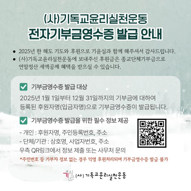 올 한해도 기도와 후원으로 기윤실과 함께 해주셔서 감사드립니다. (사)기독교윤리실천운동에 보내주신 후원금은 종교단체기부금으로 연말정산 세액공제 혜택을 받으실 수 있습니다. 주민등록번호, 사업자번호, 주소 등 개인정보를 제공하신 후원자께는 국세청 홈페이지 연말정산간소화서비스를 통해 기부금영수증 조회 및 발급이 가능합니다. (전자발급의무화로 인한 종이/파일 발급 불가)