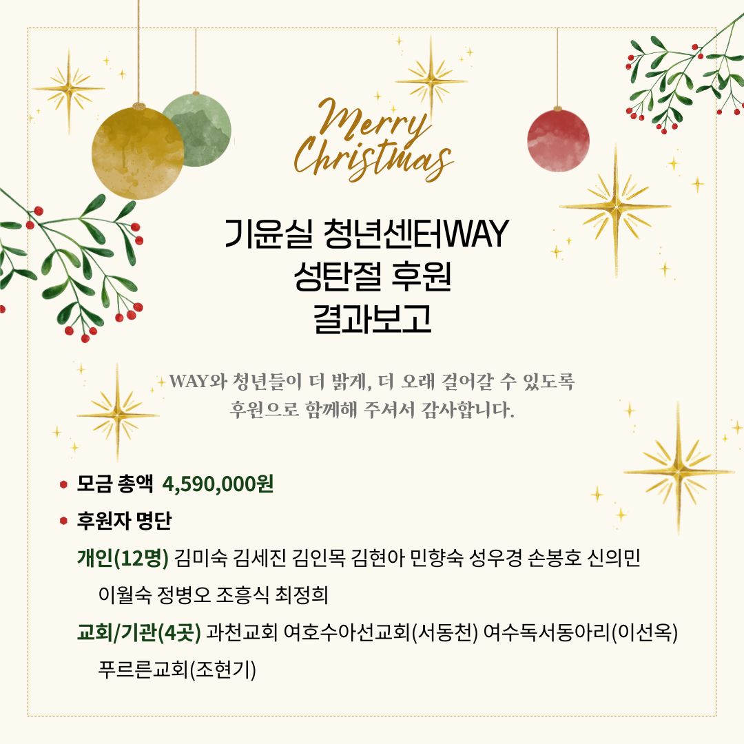 기윤실 청년센터WAY는 성탄절 후원 모금을 통해 청년들이 성탄의 기쁨과 빛을 경험할 수 있도록 돕고자 했습니다. 청년센터WAY와 청년들을 마음에 품고 후원으로 동참해주신 분들께 진심으로 감사드립니다.