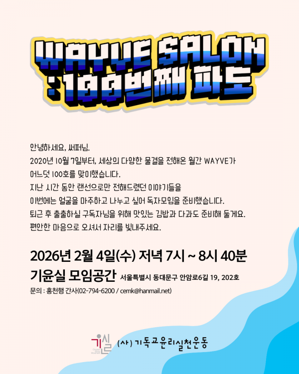 이번 살롱에서는 100호까지의 시간을 돌아보고, 앞으로 우리가 함께 만들어갈 새로운 물결에 대해 이야기 나누려 합니다. 그동안 월간 WAYVE를 아껴주신 구독자님과 함께 따뜻한 시간을 보내고 싶습니다.