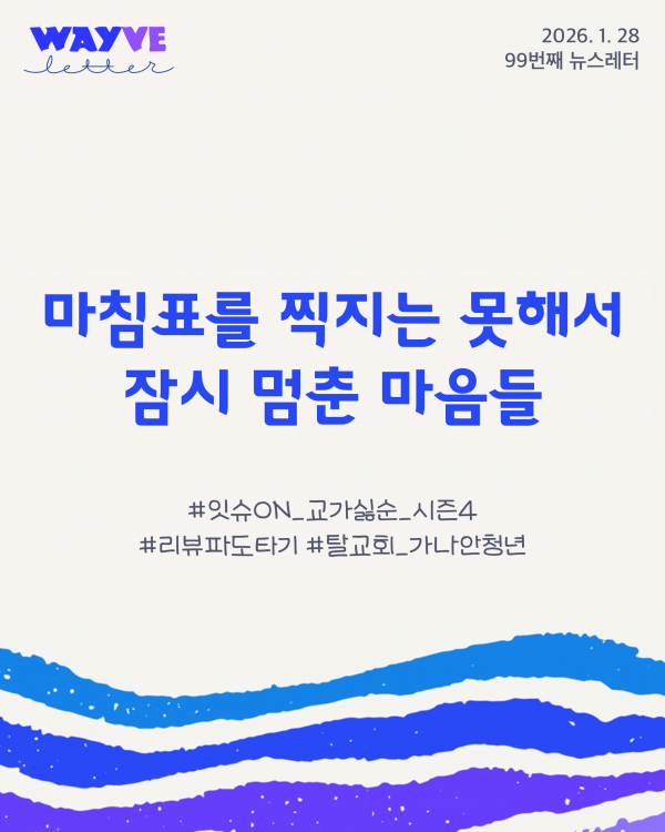 교회를 떠난다는 문장에 섣불리 마침표를 찍을 수 없어, 그저 긴 쉼표 위에 서성이는 마음들이 있습니다. <교가싫순_시즌 4>는 그런 마음들이 모여 잠시 닻을 내린 시간이었습니다. 판단하지 않는 시선과 강요 없는 대화 속에서 우리는 나의 신앙을 정직하게 마주할 수 있었습니다.