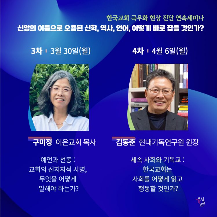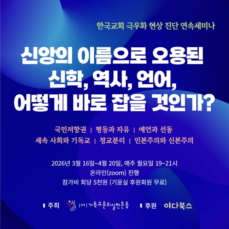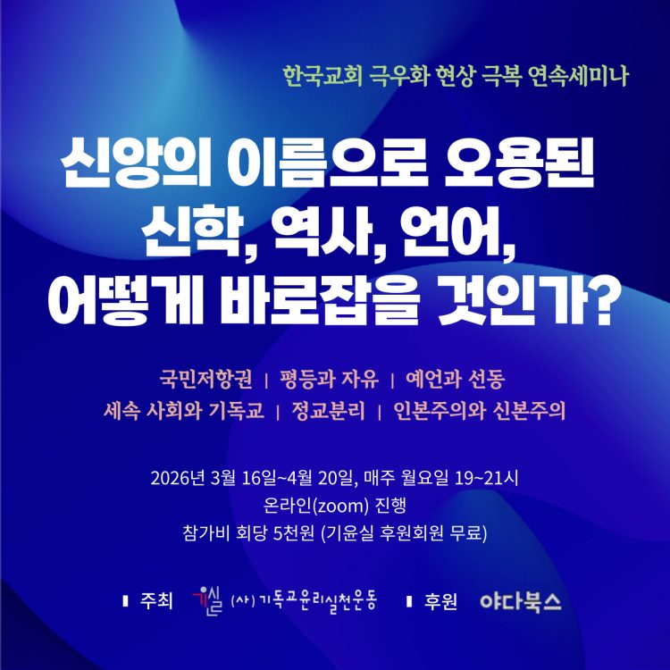 지난 12.3 비상 계엄과 이후 탄핵 국면에서 한국교회 일각이 보인 반역사적이고 반민주주의적인 모습이 지속되고 있습니다. 특히 극우화된 한국 교회는 자신의 신념과 행동을 합리화하기 위해 역사와 성경을 왜곡시키고 오용하며 잘못된 이념과 신학으로 성도들을 선동하고 있습니다. 전광훈, 손현보를 비롯한 극우 기독교에서 정교분리, 국민저항권, 교회의 선지자적 사명, 기독교 세계관 등 여러 용어를 사용하고 여기에 본 회퍼, 아브라함 카이퍼 등의 이름을 인용하지만 그 용어의 역사적 신학적 맥락을 무시하고 자신들의 행동을 합리화하는 데 무분별하게 사용하고 있는 상황입니다.