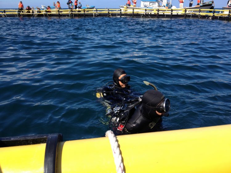 잠수부들이 그물을 열기 위해 내려가는 모습 ⓒ김영환