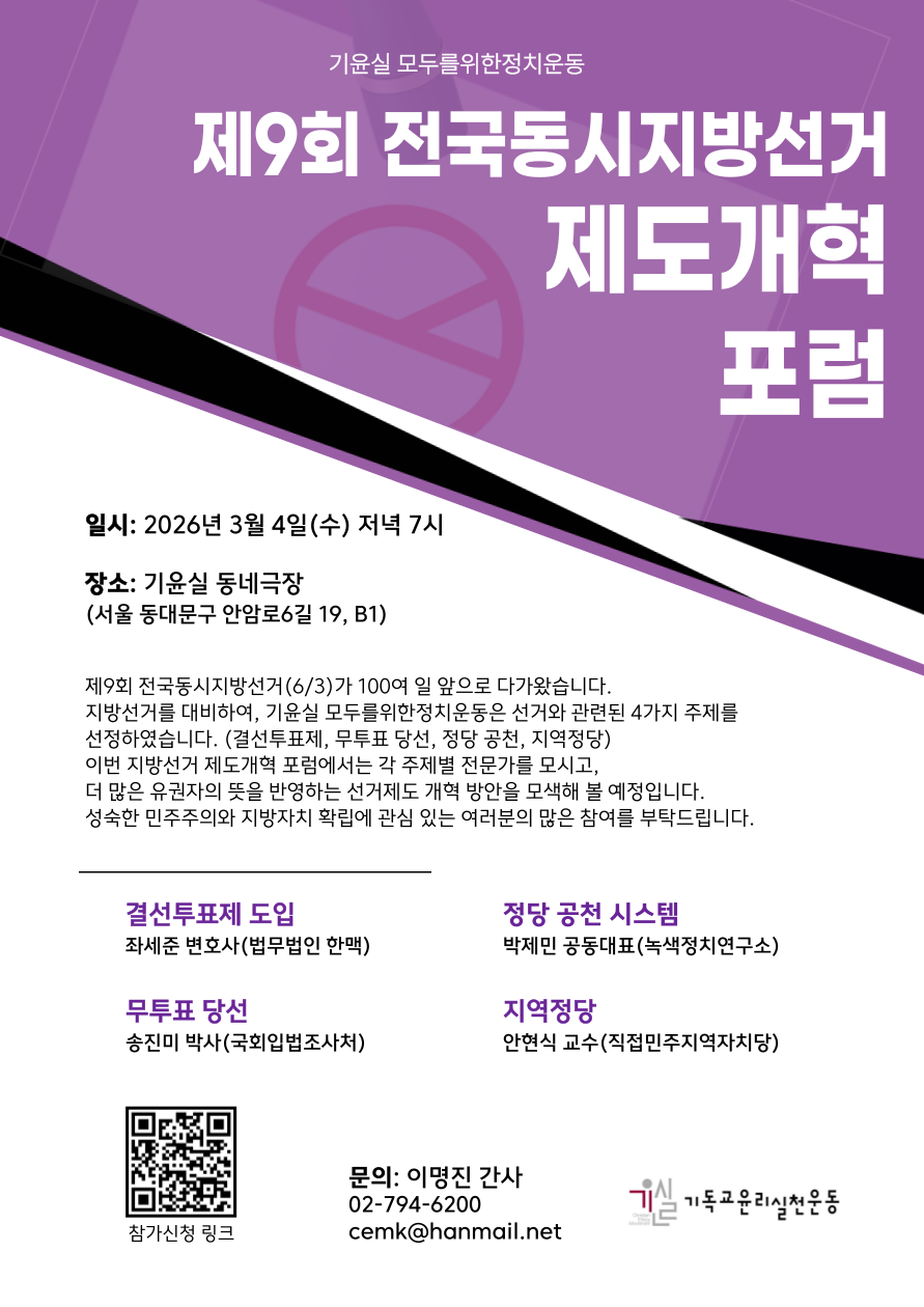 지방선거를 대비하여, 기윤실 모두를위한정치운동은 선거와 관련된 4가지 주제를 선정하였습니다. (결선투표제, 무투표 당선, 정당 공천, 지역정당)