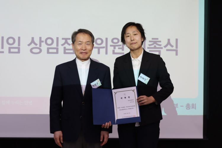 임원개선 시간에는 연임하시는 세 분의 이사와 새롭게 함께하시는 이사 한 분에 대해 결의했고, 상임집행위원으로 함께하게 된 위원께 위촉장을 증정했습니다.