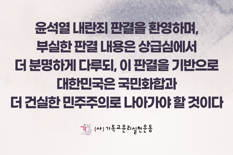 [기윤실 성명] 윤석열 내란죄 판결을 환영하며, 부실한 판결 내용은 상급심에서 더 분명하게 다루되, 이 판결을 기반으로 대한민국은 국민 화합과 더 건실한 민주주의로 나아가야 할 것이다