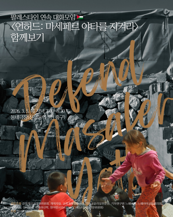격월로 진행하는 팔레스타인 연속 대화모임, 이번 시간은 다큐멘터리 <언허드(Unheard)>를 함께 보고 이야기 나눕니다. 이스라엘의 불법 점령과 인종 청소 위협 속에서도 삶의 터전을 지키기 위해 고군분투하는 ‘마세페르 야타’ 주민들의 생생한 증언을 담은 작품 입니다. 작품을 연출한 권순목 감독은 “한국 역시 이 인권 침해의 책임에서 자유롭지 않다”고 따끔하게 지적합니다. 멀리 있는 타인의 고통이 아닌 우리와 연결된 문제로 팔레스타인의 현실을 인식하는 시간이 되기를 바랍니다. 함께 보고, 깊이 이야기 나누는 연대의 자리에 초대합니다.