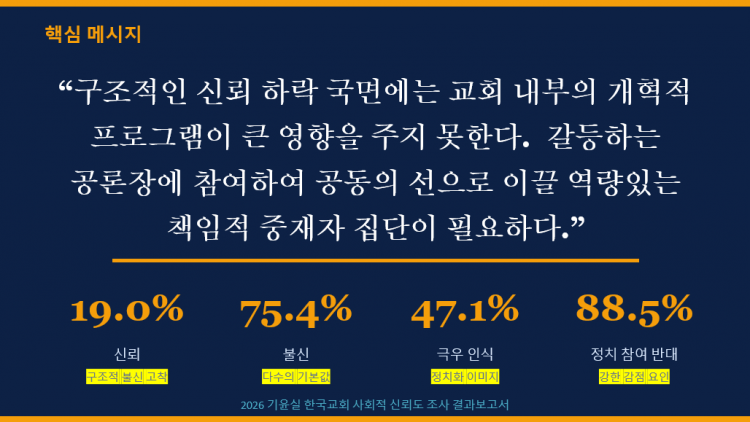 2026년 2월 27일(금), 기윤실이 (주)지앤컴리서치에 의뢰해 수행한 <한국교회의 사회적 신뢰도 여론조사>의 결과를 발표했습니다. 본 여론조사는 2026년 1월 5일부터 10일까지 6일간, 전국 만 19세 이상의 일반 시민 1,000명을 대상으로 실시되었으며, 응답 결과를 바탕으로 성석환 책임연구원(장신대 기독교와문화 교수)과 김상덕 검토위원장(한신대 평화교양대학 조교수)이 공공신학적 관점으로 분석 연구하였습니다.