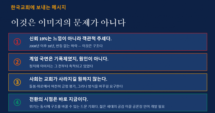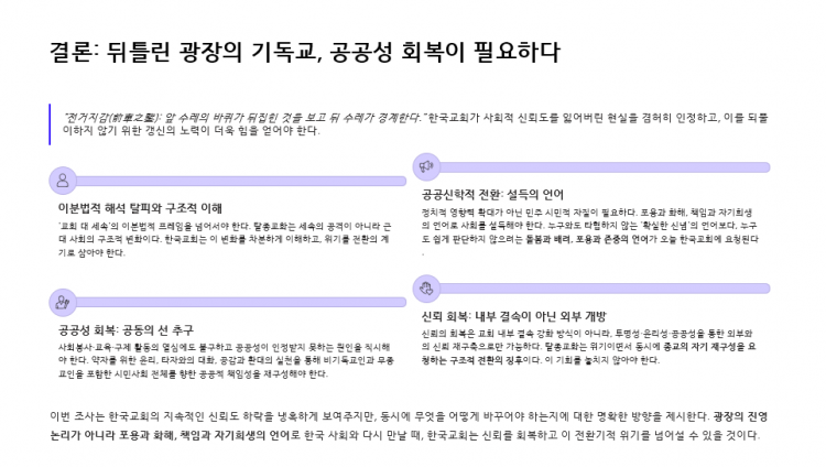 결론적으로 성석환 책임연구원은 한국교회의 사회적 신뢰도가 19%로 나타나는 것이 2008년 이후 18년간 반등없는 하락이며, 객관적/구조적 추세로 받아들여야 한다고 강조했습니다. 한국교회의 정치 참여 방식과 극우적 성향에 대한 시민들의 인식은 계엄 국면에서 다시 한 번 드러난 것이지 그 전부터 정치화 이미지가 축적되어 있었고 이것이 한국교회의 신뢰도 하락에 영향을 미친 것이라고 분석했습니다. 그러나 사회는 한국교회의 돌봄사역과 정서적 측면에서 여전히 긍정적인 부분이 있다고 평가하고 있으며, 한국교회가 맞이한 위기 상황에서 어떻게 전환할 것인지, 윤리성/관계성/공공성을 어떻게 개선할 것인지 진지하게 고민해야 한다고 제언했습니다. 구조적 신뢰 하락의 국면에서 교회 내부의 개혁 의제와 프로그램에 몰두하는 것보다, 한국 사회의 갈등과 위기를 공동의 선으로 이끌 책임있는 중재자로서 한국교회가 공적 역할을 감당하는 집단으로서 역량을 키울 필요가 있다는 제언으로 발표를 마무리 했습니다.