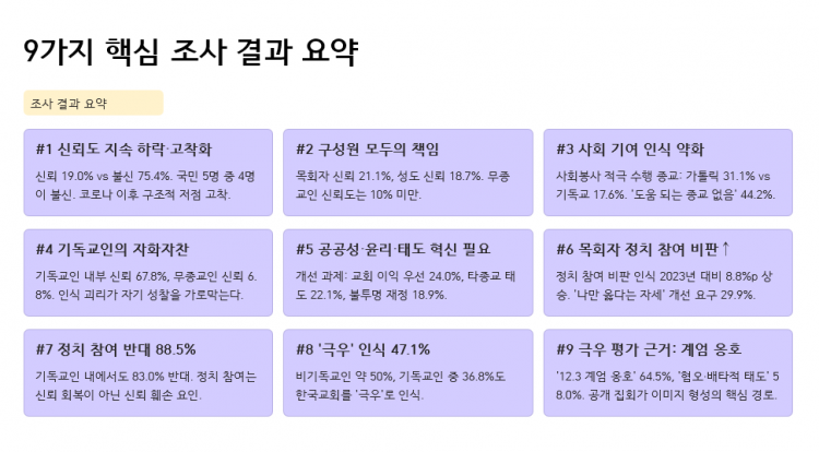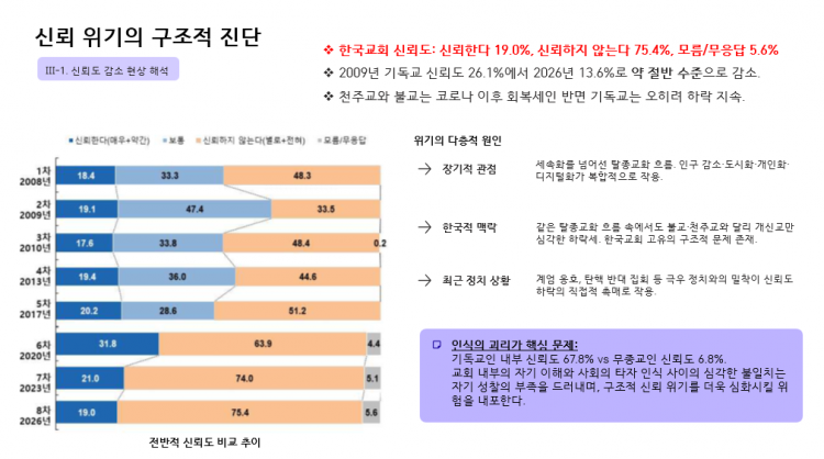 본 여론조사는 2008년을 시작으로 2009년, 2010년, 2013년, 2017년, 2020년, 2023년, 그리고 이번 2026년까지 총 8차에 걸쳐 실시되었으며, 한국교회, 목회자, 기독교인에 대한 신뢰도 및 신뢰도 제고를 위한 개선 사항, 종교별 이미지 및 선호도, 한국 사회에 대한 기여도, 조사 시기 전후 한국 사회와 교계의 시의성 있는 사안과 관련한 한국교회 인식 등의 문항을 통해 다각적·통합적 평가를 수집하고 있습니다.