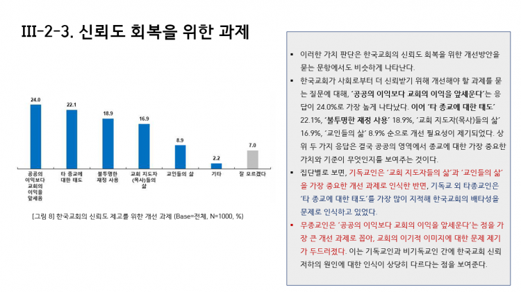 목회자의 신뢰도 제고를 위한 개선점으로도 ‘교회 이익 우선하는 태도(24.6%), 정치적 발언과 집회 참여(21.6%), 윤리도덕성 문제(21.1%)가 상위 응답으로 나타나 한국교회와 목회자의 공공성 결여, 정치적 행동, 도덕성 문제, 즉 공적 책임성과 사회적 중립성의 관점에서 반복된 지적이 나타나고 있음을 확인할 수 있다고 말했습니다.