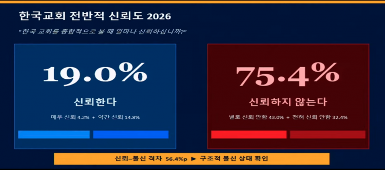 한국교회 신뢰도 여론조사에서 가장 대표적이고 중요한 문항인 “한국교회를 종합적으로 볼 때 얼마나 신뢰하십니까?”라는 질문에 19.0%가 신뢰한다(매우4.2%, 약간 14.8%)고 응답했습니다. 반면 신뢰하지 않는다는 응답은 75.4%(별로43.0%, 전혀 32.4%)입니다. 신뢰와 불신의 격차가 56.4%p로, 2020년 31.9%p, 2023년 52.3%p였던 것과 비교하였을 때 구조적 불신 상태가 고착화되고 있다고 판단할 수 있습니다.