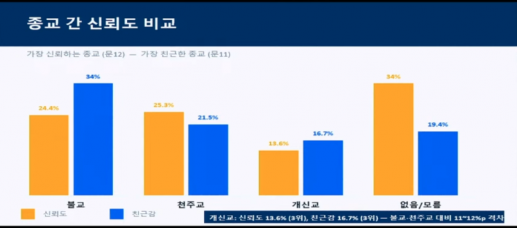 종교간 신뢰도와 친근감 정도를 비교하였을 때, 개신교는 두 문항 모두에서 불교와 천주교 다음으로 가장 낮은 응답을 받았습니다. 성석환 책임연구원은 신뢰하는 종교가 없다는 응답이 34%라는 것에 주목했습니다. 이는 여러 기관에서 제시하고 있듯 한국 사회의 탈종교화 과정에서 드러나는 객관적인 수치이며, 이때 ‘종교가 없는 사람이 종교를 가지고자 할 때 어떤 종교를 고려할 것인가?’라는 이런 질문을 던진다면, 당연히 개신교는 고려대상이 되기 어려울 것이라고 판단했습니다. 신뢰도나 친근감의 수치를 보면서 개신교가 처해있는 위치를 객관적으로 볼 수 있다는 것입니다.