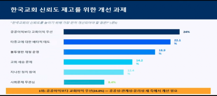 목회자의 신뢰도 제고를 위한 개선점으로도 ‘교회 이익 우선하는 태도(24.6%), 정치적 발언과 집회 참여(21.6%), 윤리도덕성 문제(21.1%)가 상위 응답으로 나타나 한국교회와 목회자의 공공성 결여, 정치적 행동, 도덕성 문제, 즉 공적 책임성과 사회적 중립성의 관점에서 반복된 지적이 나타나고 있음을 확인할 수 있다고 말했습니다.