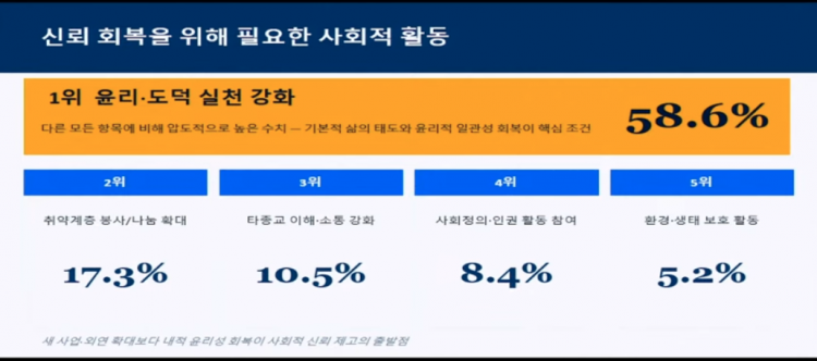 또한 신뢰 회복을 위해 필요한 사회적 활동이 무엇인지를 물었을 때 ‘윤리와 도덕 실천 강화’가 58.6%로 압도적인 응답률을 보여 교회와 그리스도인들의 기본적 삶의 태도와 윤리적 일관성 회복이 핵심 조건이라고 볼 수 있습니다. 또한 하위로 꼽힌 ‘사회정의와 인권활동’, ‘환경과 생태 보호 활동’ 등 교회 내부에서 계몽과 각성이 강조되는 활동이 1위로 꼽힌 윤리와 도덕 실천 강화로 연결되지 않고 있다고 평가헸는데, 교회의 사회적 이슈의 개혁과 관련된 활동이 교회 공동체의 윤리적 도덕적 실천 강화라는 것으로 번역되서 드러나지 않는다면 한국교회의 신뢰도 개선에는 도움이 되지 않을 것이라고 지적했습니다.