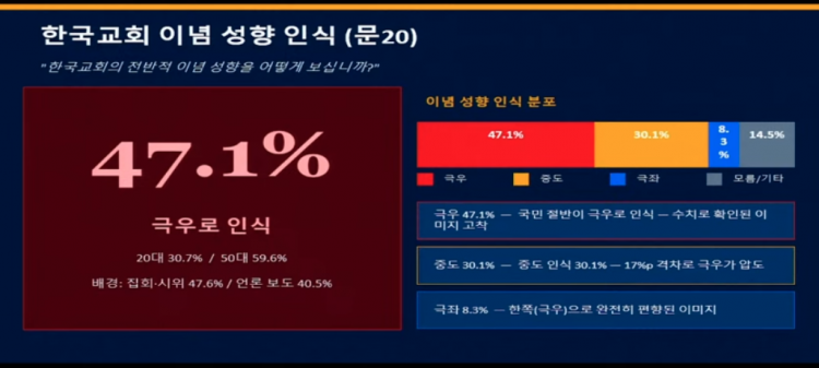 이번 조사에서 특별하게 추가된 현실 정치와 기독교의 관계성에 대한 문항 중, ‘한국교회의 전반적 이념 성향을 어떻게 보십니까?’라는 질문에 ‘대체로 극우+일부가 극우 성향’하는 정도가 47.1%로 나타나 ‘대체로 극좌+일부가 극좌 성향'(8.3%)보다 압도적으로 높게 나타났습니다. 성석환 책임연구원은 ‘극우’라고 응답한 이들 중 20대가 30.7%, 50대가 59.6%인 것에 주목해볼 때, 한국교회를 신뢰하지 않는 응답이 매우 높은 50대가 한국교회를 극우라고 인식하고 있다는 것은 한국교회의 극우적 모습이 한국교회의 신뢰도를 갉아먹는 인자가 되고 있다고 분석 했습니다. 또한 30.1%로 나타난 중도의 수치를 50% 정도로 끌어올릴 수 있다면 한국교회가 정치적 갈등과 극단적 대립이 나타나고 있는 한국 사회를 완충할 수 있는 완충지를 넓힐 수 있다는 점에서 중요한 의미를 가진다며, 특정 정치 세력과 일치를 드러내는 것이 교회에 덕이나 득이 되는 것이 아니라, 온건한 중간 지대를 확장하는 것이 신뢰도를 향상시키는데 도움이 될 것이라고 제언했습니다.