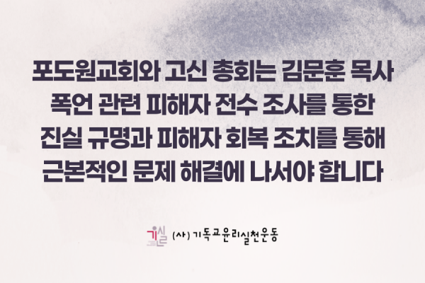 [성명서]포도원교회와 고신 총회는 김문훈 목사 폭언 관련 피해자 전수 조사를 통한 진실 규명과 피해자 회복 조치를 통해 근본적인 문제 해결에 나서야 합니다