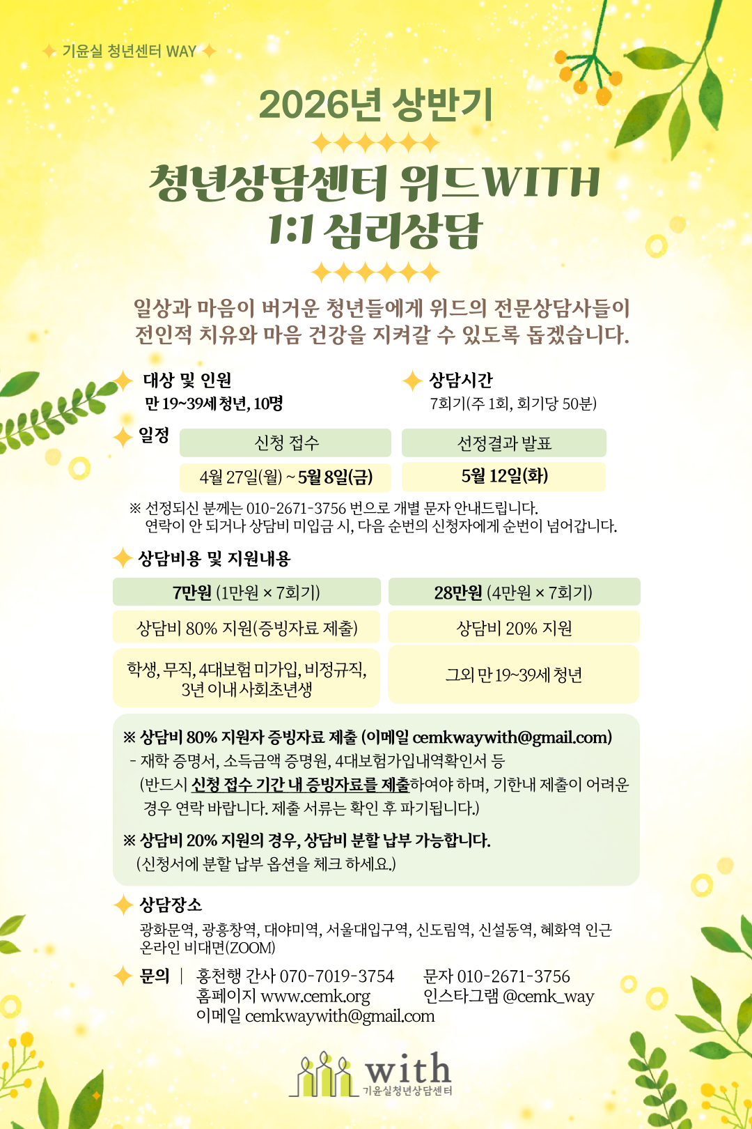 ※ 상담비 80% 지원자 증빙자료 제출 (이메일 cemkwaywith@gmail.com)
