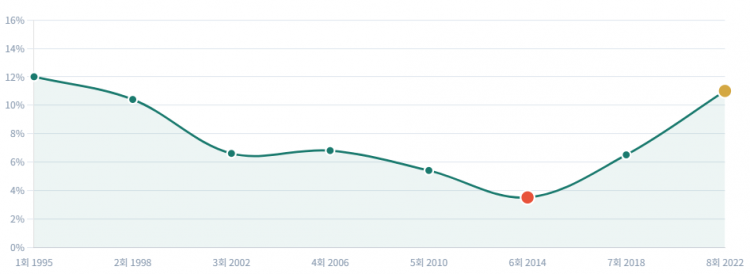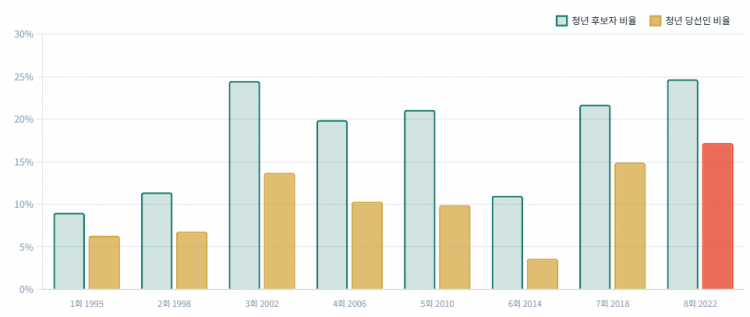 가장 큰 간극을 보인 2010년(5회)은 후보 21.1%에서 당선 9.9%로 격차가 -11.2%p에 달했습니다. 가장 요란하게 ‘청년 공천’을 외쳤던 2022년(8회) 역시 후보 24.7%에서 당선 17.2%(-7.5%p)로 줄어들며, 공천 명단이라는 쇼윈도와 실제 의회 권력 사이의 벽을 넘지 못했습니다.